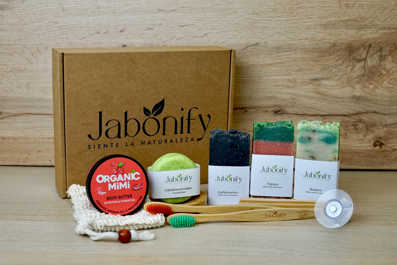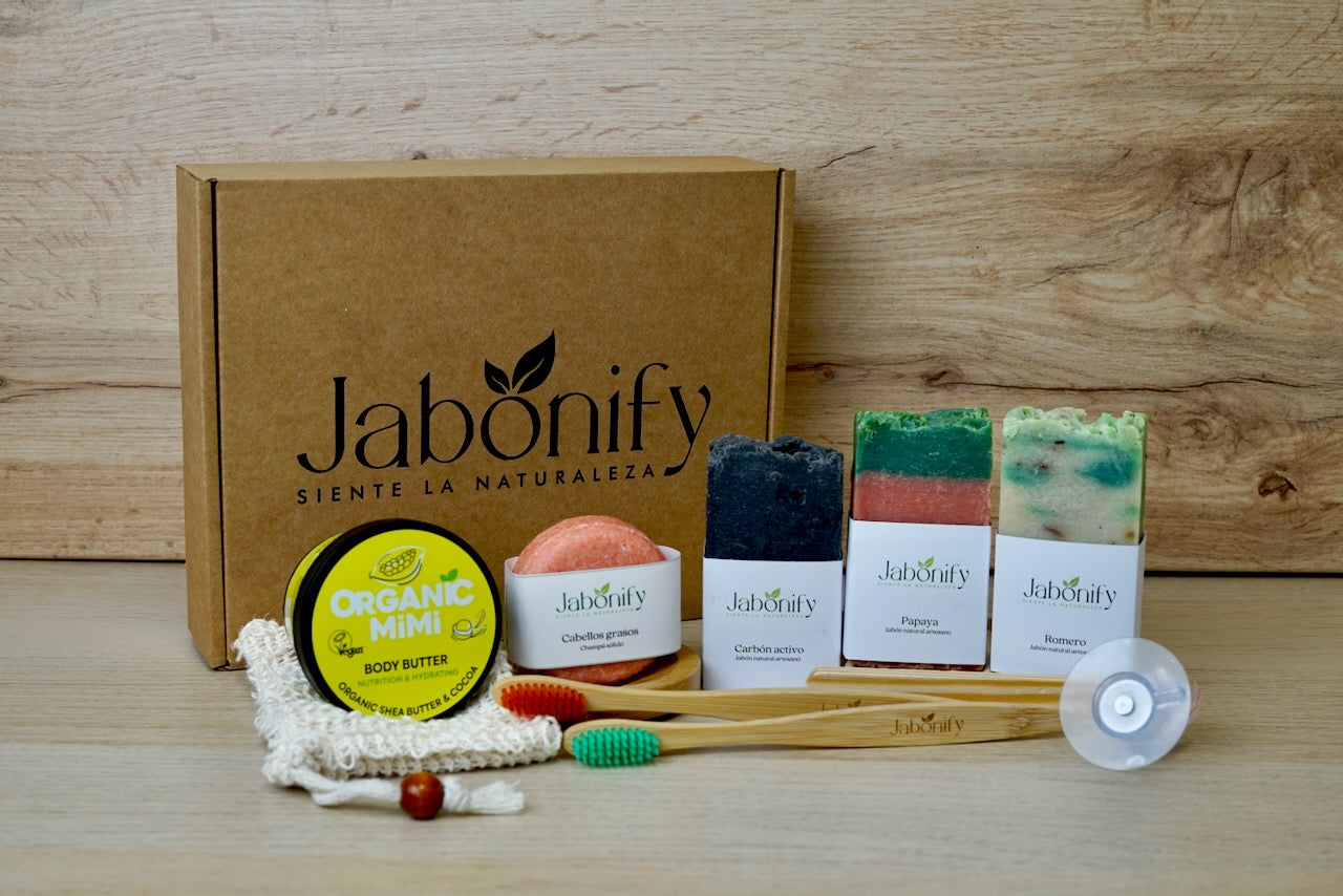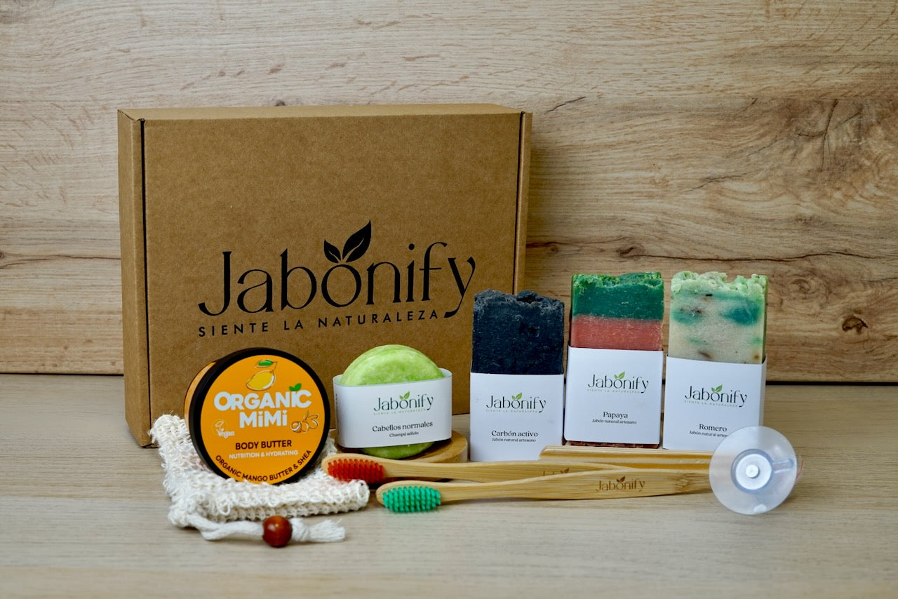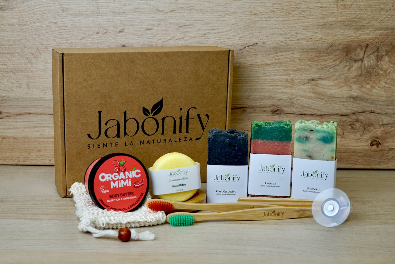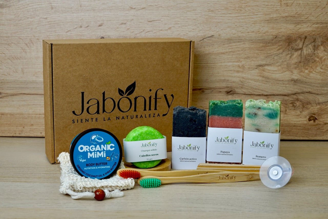 Sostenibilidad y Estilo: Los accesorios, como las jaboneras magnéticas y de diseño, están creados para optimizar el uso de los productos, mientras que los cepillos de bambú y la bolsa de sisal contribuyen a una rutina ecoamigable.