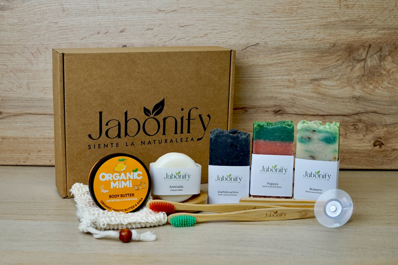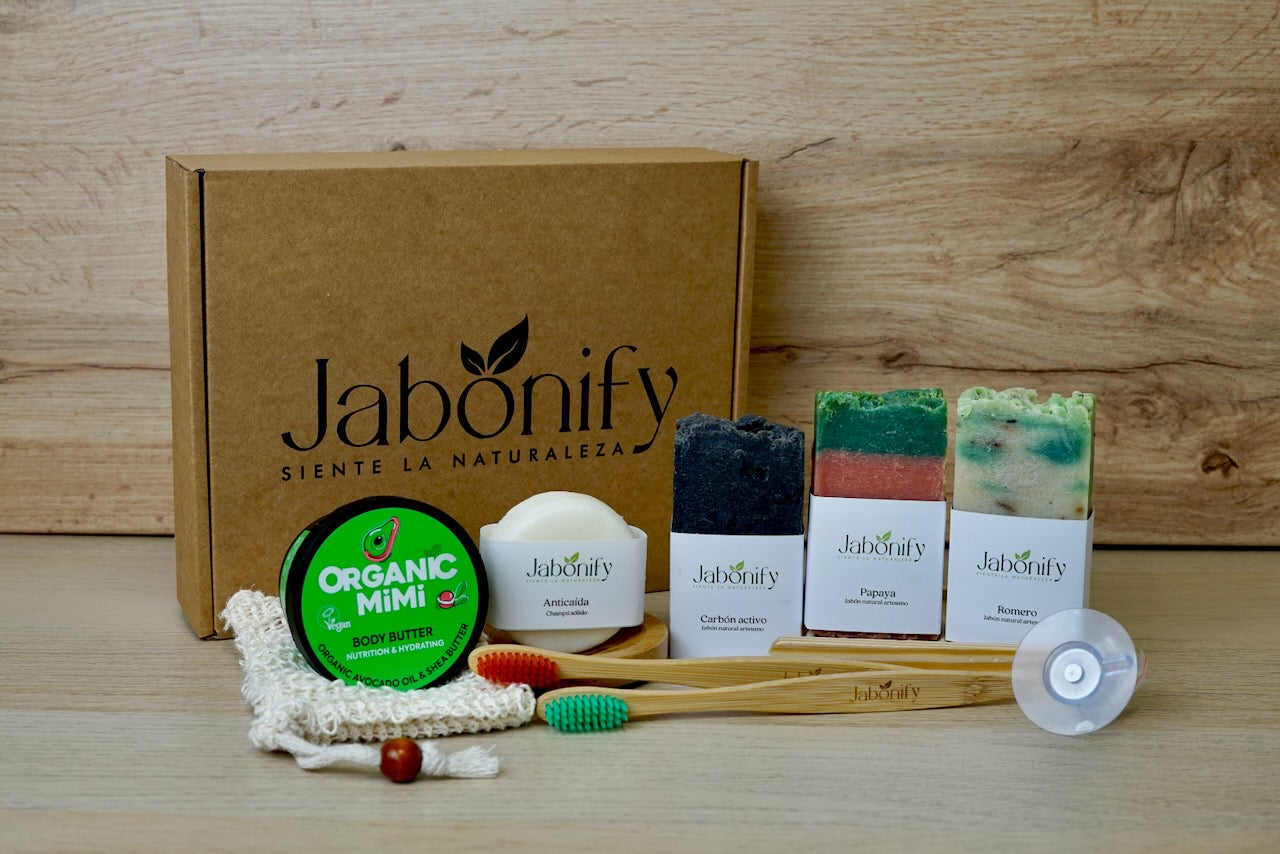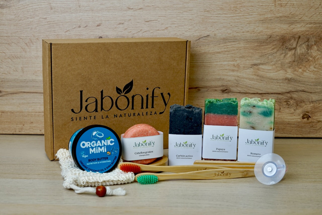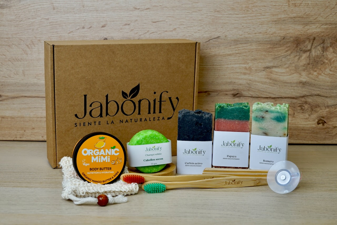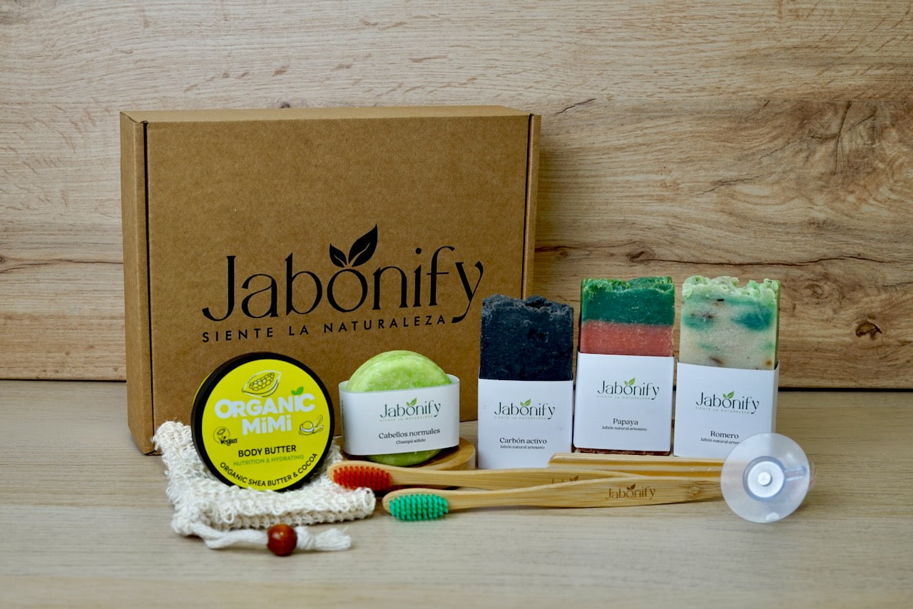 Sostenibilidad y Estilo: Los accesorios, como las jaboneras magnéticas y de diseño, están creados para optimizar el uso de los productos, mientras que los cepillos de bambú y la bolsa de sisal contribuyen a una rutina ecoamigable.