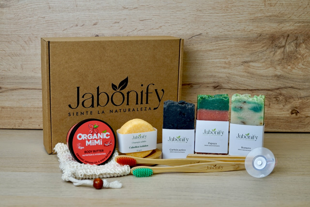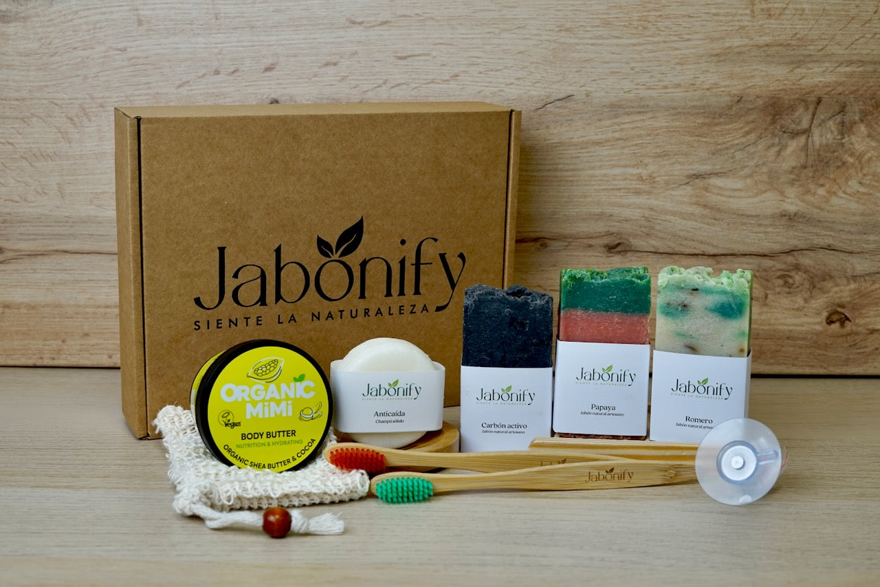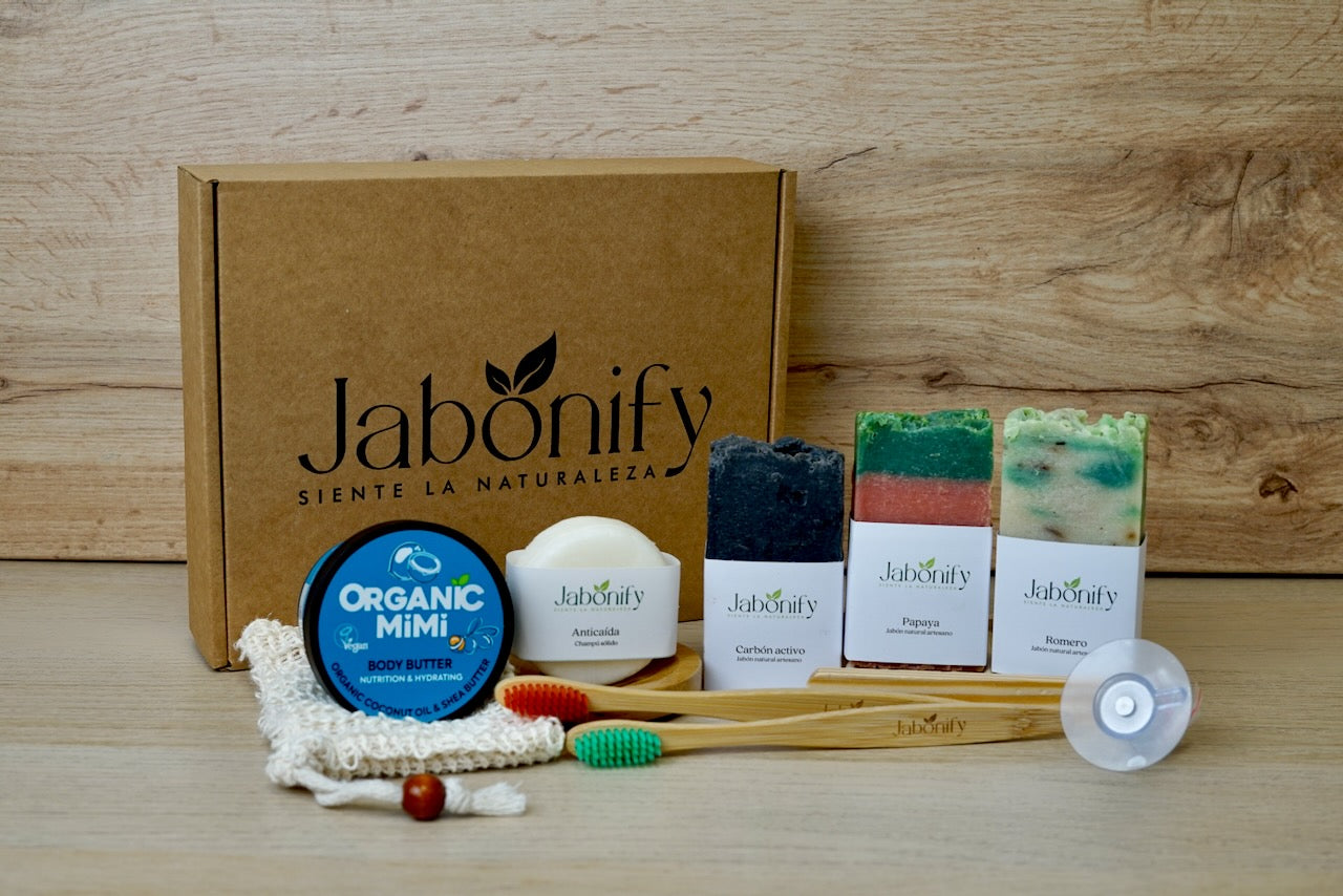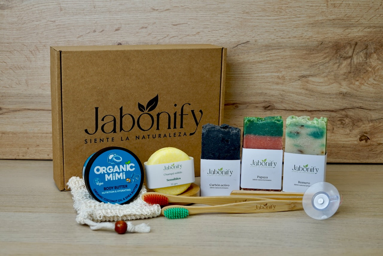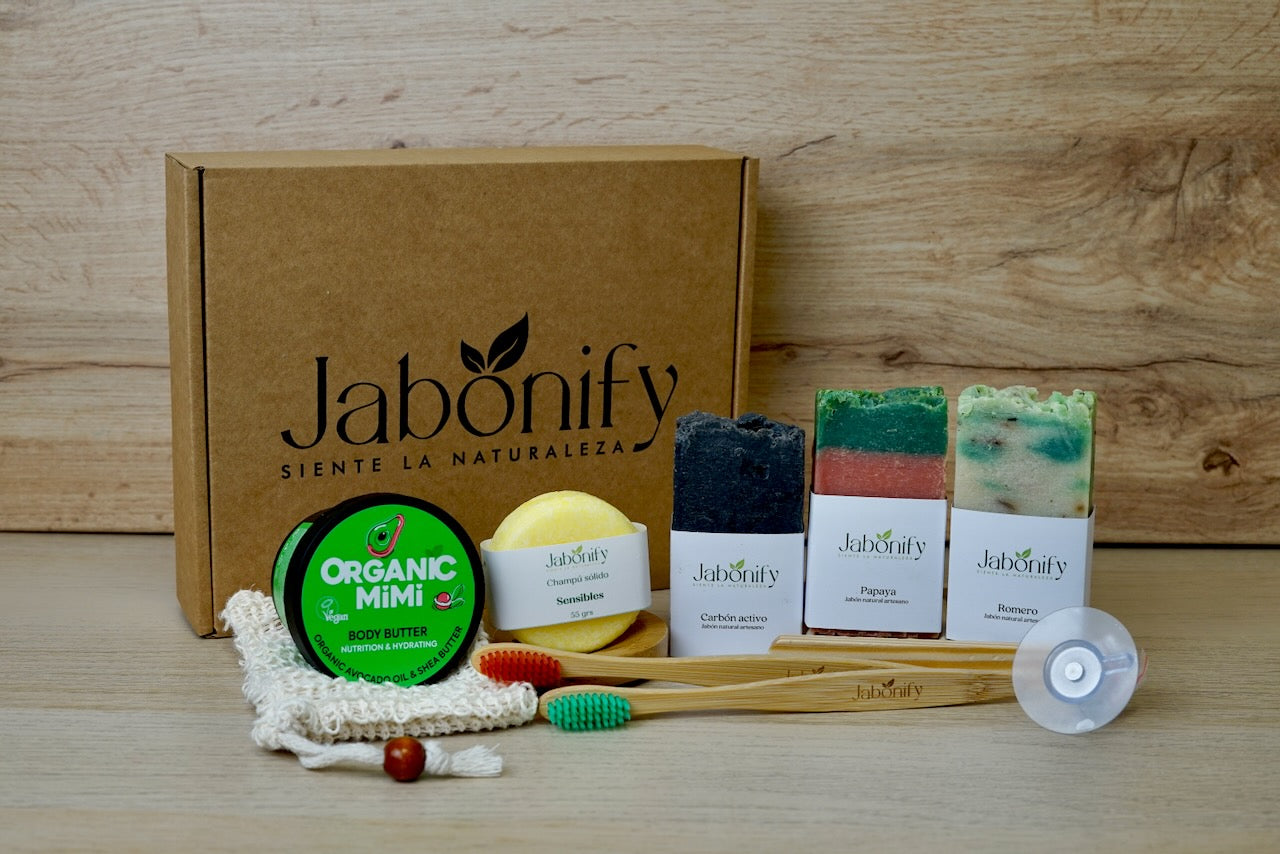 Sostenibilidad y Estilo: Los accesorios, como las jaboneras magnéticas y de diseño, están creados para optimizar el uso de los productos, mientras que los cepillos de bambú y la bolsa de sisal contribuyen a una rutina ecoamigable.