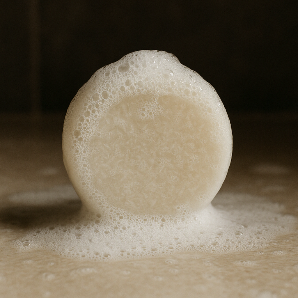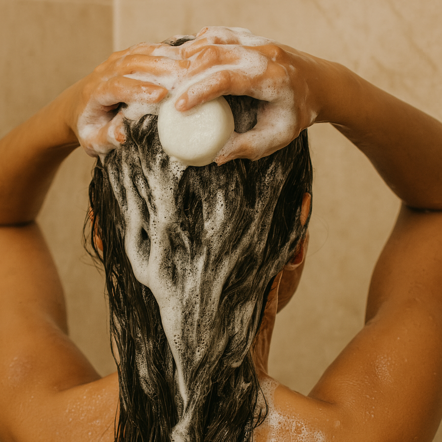 2️⃣ Esfregue a barra diretamente no cabelo molhado até formar espuma.